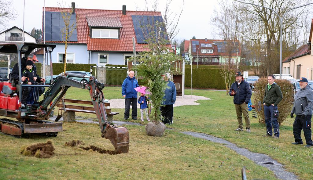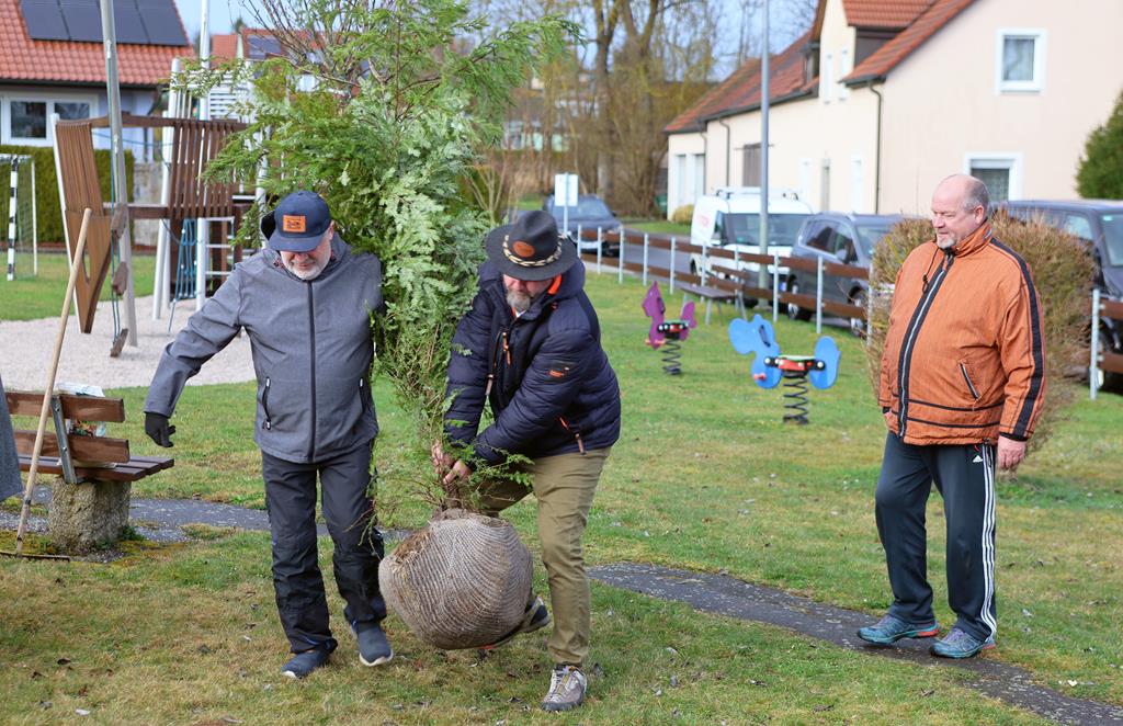 Floß. Herausforderung angenommen und bestanden: Die im Herbst letzten Jahres in den sozialen Netzwerken kursierende Baumpflanz-Challenge verbindet Klimaschutz, Kameradschaft und Kreativität. Für die Siedlergemeinschaft (SG) Argumente genug, die 2025 ausgesprochene Nominierung des FC Bayern München-Fanclubs natürlich anzunehmen und mit leichter zeitlicher Verzögerung umzusetzen. Am Mittwochabend pflanzte das Team um SG-Vorsitzenden Manfred Bäuml auf dem Gelände des Siedlerhaisls im Spielplatzbereich eine drei Meter hohe Hemlocktanne.